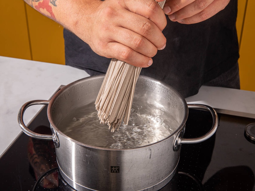 Nấu mì soba theo hướng dẫn trên bao bì.