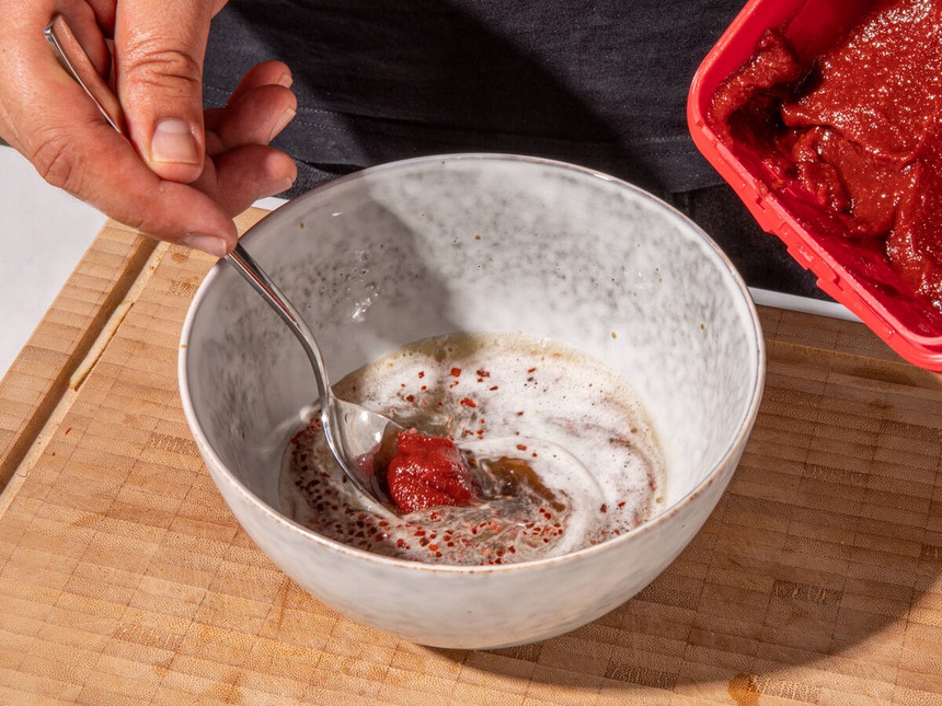 Đem hỗn hợp lọc qua rây mịn rồi kết hợp với ớt bột Hàn Quốc, gochujang, giấm gạo, nước tương, đường và muối.