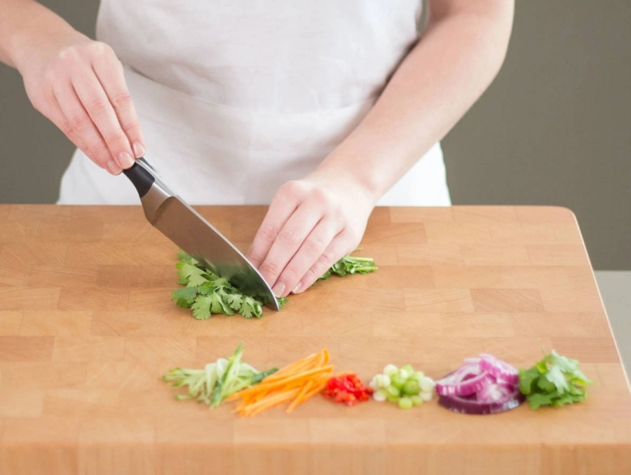 Xắt nhỏ hành lá, rau mùi và ớt tươi.