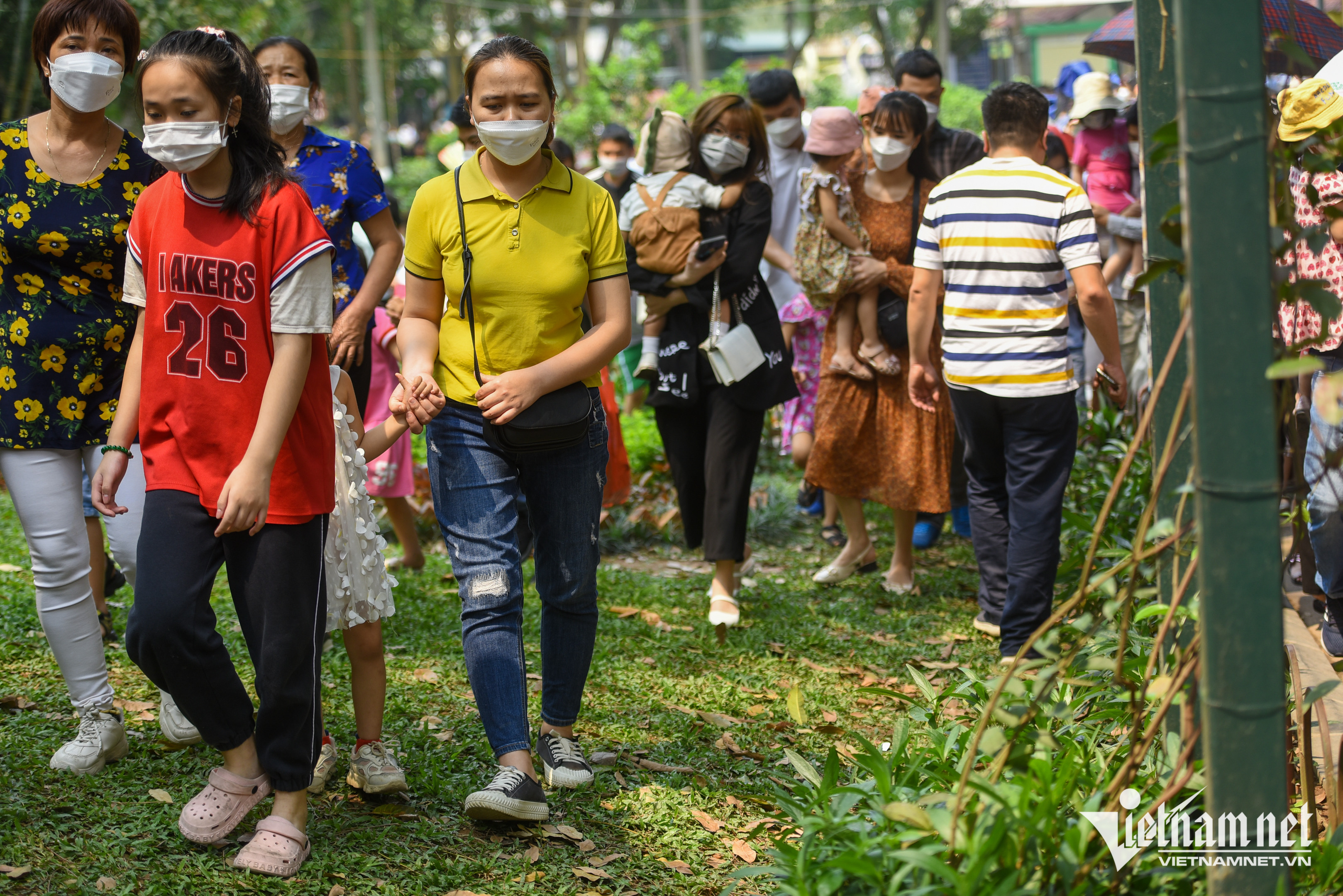 Công viên Thủ Lệ, Hà Nội đông chật kín trong ngày nghỉ lễ giỗ Tổ Hùng Vương. Nhiều người bất chấp đi xuyên thảm cỏ để "vượt tắc", trẻ em chán nản vì cảnh "người xem người".