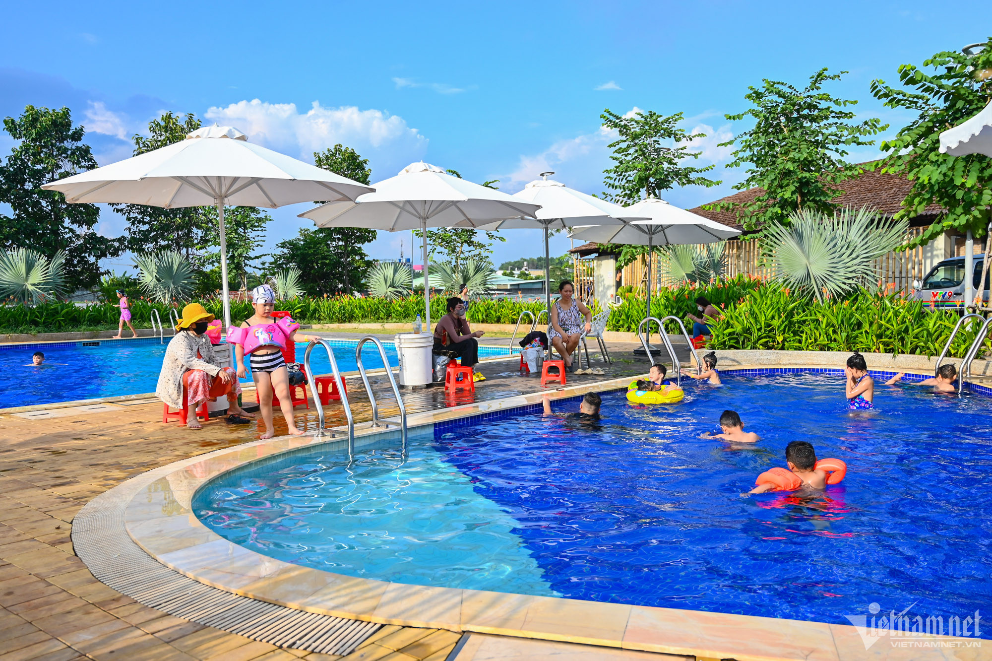 Khu vực hồ bơi ngoài trời được nhiều phụ hynh cho các em nhỏ tới tập bơi, giải nhiệt.