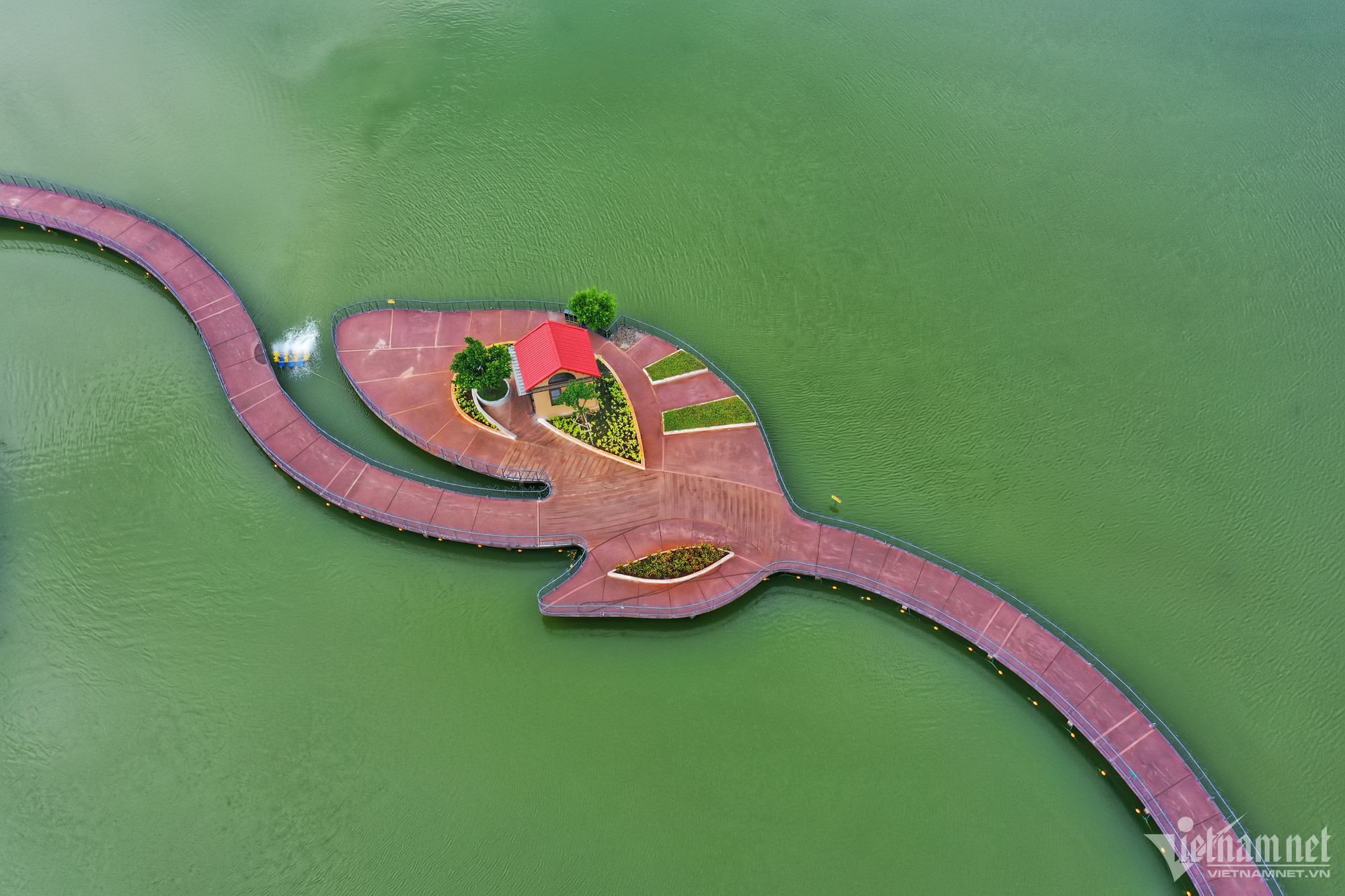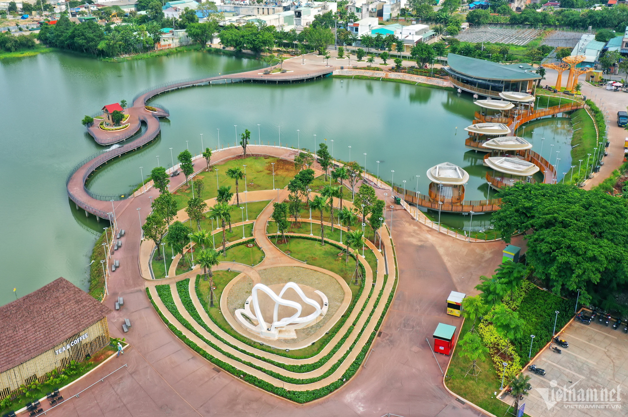 Nhìn từ trên cao có thể thấy rõ quảng trường văn hóa hơn 2.000m2 được thiết kế như hình quả cau, còn khu nhà thuỷ tạ ven hồ được cách điệu bằng hình lá trầu.