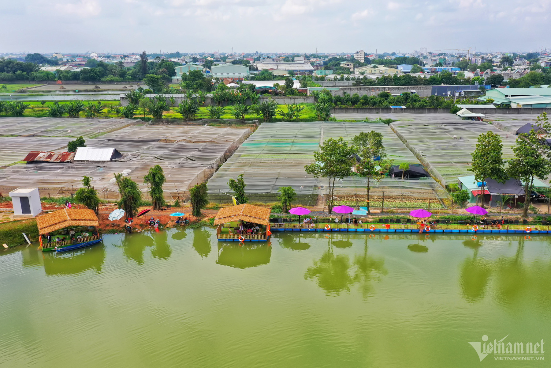 Khu mặt nước rộng hơn 29.000m2, sâu khoảng 3m, được cải tạo từ ao nước có sẵn. Góc hồ được dựng chòi và ô lớn để khách tới câu cá, thư giãn.