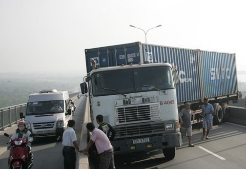 Được biết, sáng ngày 3/11, xe đầu kéo 57K 8192 kéo rơ-mooc chở container loại 40feet đầy hàng từ cảng Cát Lái đi về hướng miền Tây đã gặp sự cố sau khi leo lên đến giữa cầu Phú Mỹ.