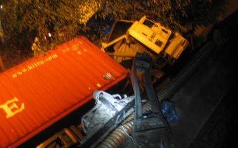 nát bét, 2 bánh trước bật tung ra ngoài. Chiếc xe container không chở bất cứ