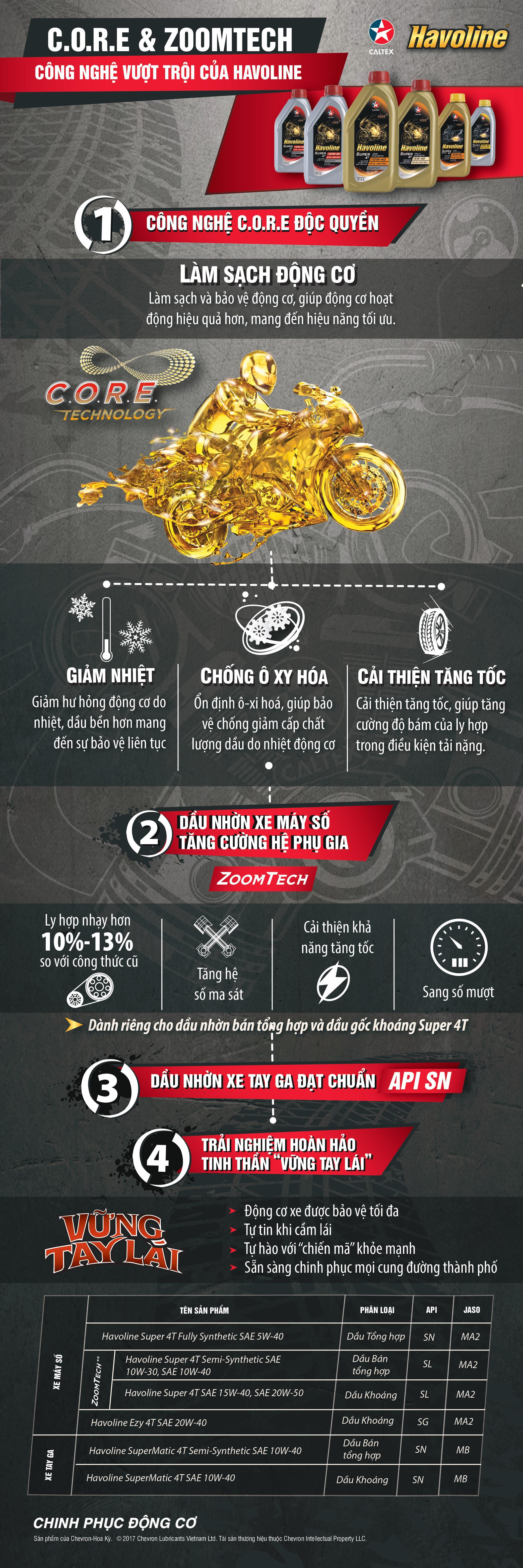 Đáp ứng nhu cầu chăm sóc xe hiệu quả hơn của người tiêu dùng, các sản phẩm thuộc thế hệ dầu nhờn mới của Caltex Havoline đã được nâng cấp công nghệ Core và Zoomtech tiên tiến, đem lại hiệu năng tối đa cho động cơ.