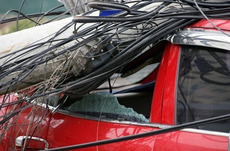 | Chiếc xe ô tô bị cột điện đè trúng. |