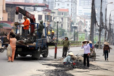 đi đến đường Trung Hòa, thấy công nhân đang dỡ đường dây điện và hạ cột xuống,
