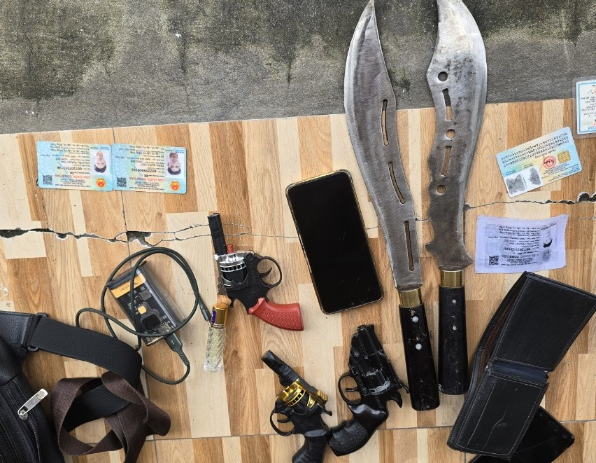 Đối tượng còn lại là Trần Quốc Kiệt (19 tuổi) bỏ chạy về huyện Lấp Vò (Đồng Tháp) cũng bị Công an huyện bắt giữ. Lực lượng chức năng thu giữ 2 dao tự chế, 3 khẩu súng (chưa rõ chủng loại) và 1 xe máy.