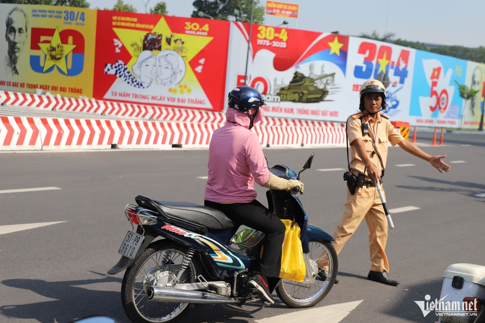 Tại đây, CSGT di chuyển xuống làn đường để phân luồng, hướng dẫn tất cả xe lưu thông nhằm tạo thuận lợi cho người dân di chuyển qua khu vực.