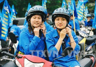 Đoàn viên thanh niên tuyên truyền đội mũ bảo hiểm khi điều khiển xe máy tham gia giao thông. Ảnh: TTXVN - VNA |