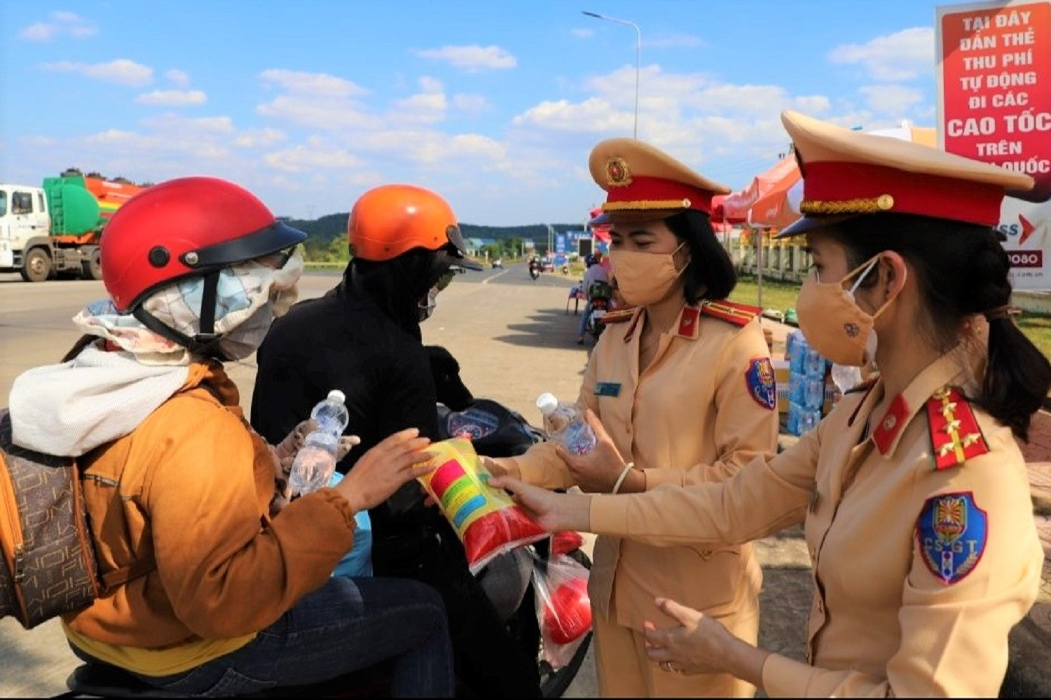 Ghi nhận tại Đắk Nông, lực lượng thuộc Phòng CSGT đã cắt cử cán bộ, chiến sĩ ứng trực tại các chốt giao thông để hỗ trợ người dân ở các tỉnh phía Nam về Tây Nguyên ăn Tết. Các phần quà được chuẩn bị là chai nước, khăn lạnh, bánh mì, khoai lang luộc… thắm nghĩa tình quân dân.
