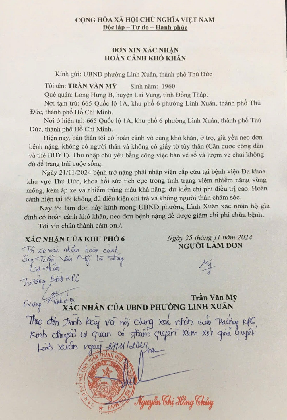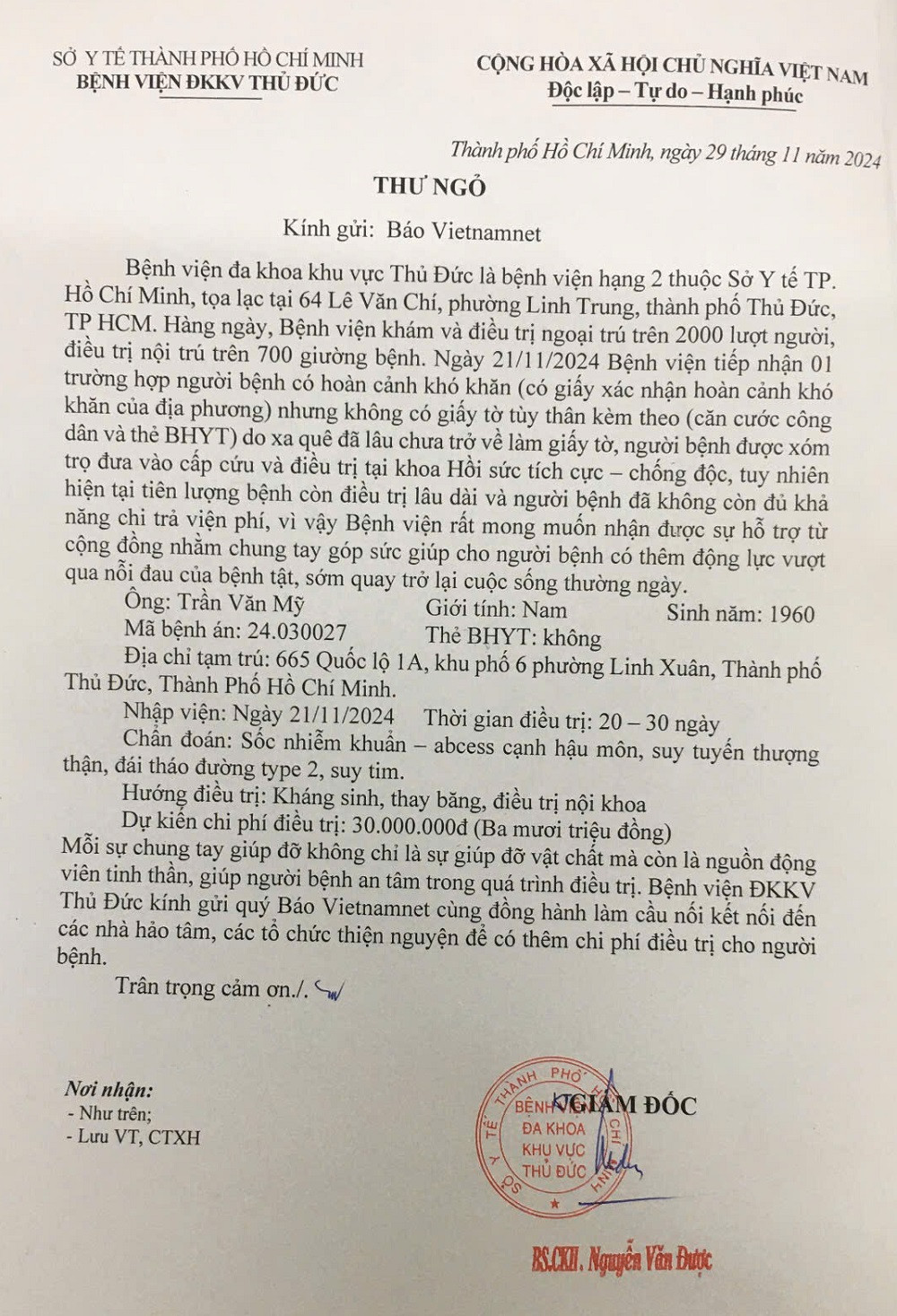 Mới đây, VietNamNet nhận được thư ngỏ của Bệnh viện Đa khoa khu vực Thủ Đức. Có bệnh nhân hoàn cảnh rất khó khăn đang cần sự giúp đỡ của bạn đọc hảo tâm. Ông Trần Văn Mỹ (64 tuổi) không có bất kỳ mảnh giấy tùy thân nào, được hàng xóm chung nhà trọ đưa đi cấp cứu ngày 21/11 sau 2 ngày ốm liệt giường. Qua thăm khám, bác sĩ phát hiện tình trạng bệnh của ông khá nghiêm trọng.