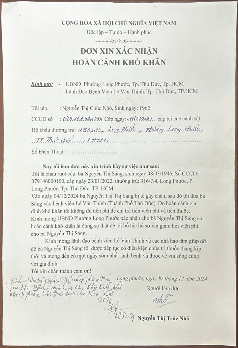 Mọi sự giúp đỡ xin gửi về: 1. Gửi trực tiếp: Phòng Công tác xã hội bệnh viện Lê Văn Thịnh hoặc bà Nguyễn Thị Chúc Nhỏ; Địa chỉ: 316/7/4 Long Phước, phường Long Phước, TP.Thủ Đức, TP.HCM. SĐT: 0329248084 (bà Chúc Nhỏ). 2. Ủng hộ qua Báo VietNamNet: Ghi rõ ủng hộ MS 2024.354 (Bà Nguyễn Thị Sáng) Chuyển khoản: Báo VIETNAMNET Số tài khoản: 0011002643148. Sở giao dịch Ngân hàng Ngoại Thương Việt Nam - 198 Trần Quang Khải, Hà Nội - Chuyển khoản từ nước ngoài: Bank account: Báo VIETNAMNET - The currency of bank account: 0011002643148 - Bank:- BANK FOR FOREIGN TRADE OF VIETNAM - Address: 198 Tran Quang Khai, Hanoi,Vietnam - SWIFT code: BFTVVNV X - Qua TK ngân hàng Vietinbank: Chuyển khoản: Báo VietNamNet Số tài khoản: 114000161718 Ngân hàng TMCP Công Thương Việt Nam - Chi nhánh Đống Đa - Chuyển tiền từ nước ngoài: Vietnam Joint Stock Commercial Bank for Industry and Trade, Dong Da Branch - Address: 183 Nguyễn Lương Bằng, quận Đống Đa, Hà Nội - Swift code: ICBVVNVX126 3. Hoặc trực tiếp báo VietNamNet: - Phía Bắc: Địa chỉ: tầng 3, tòa nhà C’Land,156 Xã Đàn 2, phường Nam Đồng, quận Đống Đa, Hà Nội. - Phía Nam: Văn phòng đại diện báo VietNamNet phía Nam, số 27 Nguyễn Bỉnh Khiêm, Quận 1, TP.HCM. Điện thoại: 19001081 |