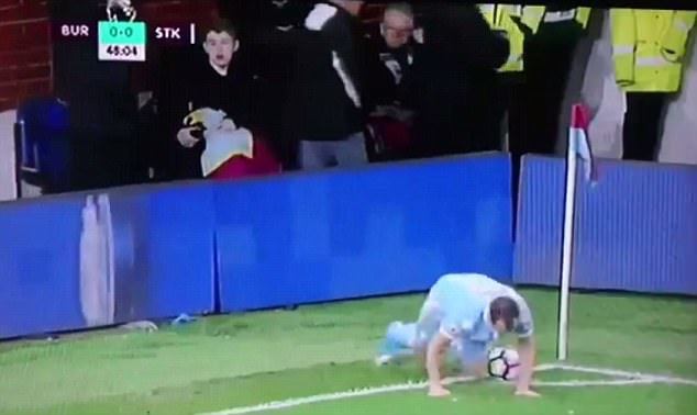 Tình huống phút 49 trận Burnley vs Stoke, Charlie Adam chuẩn bị bước lên thực hiện cú phạt góc thì bất ngờ trượt chân, ngã chạm tay vào bóng khiến nhiều CĐV phải phì cười.