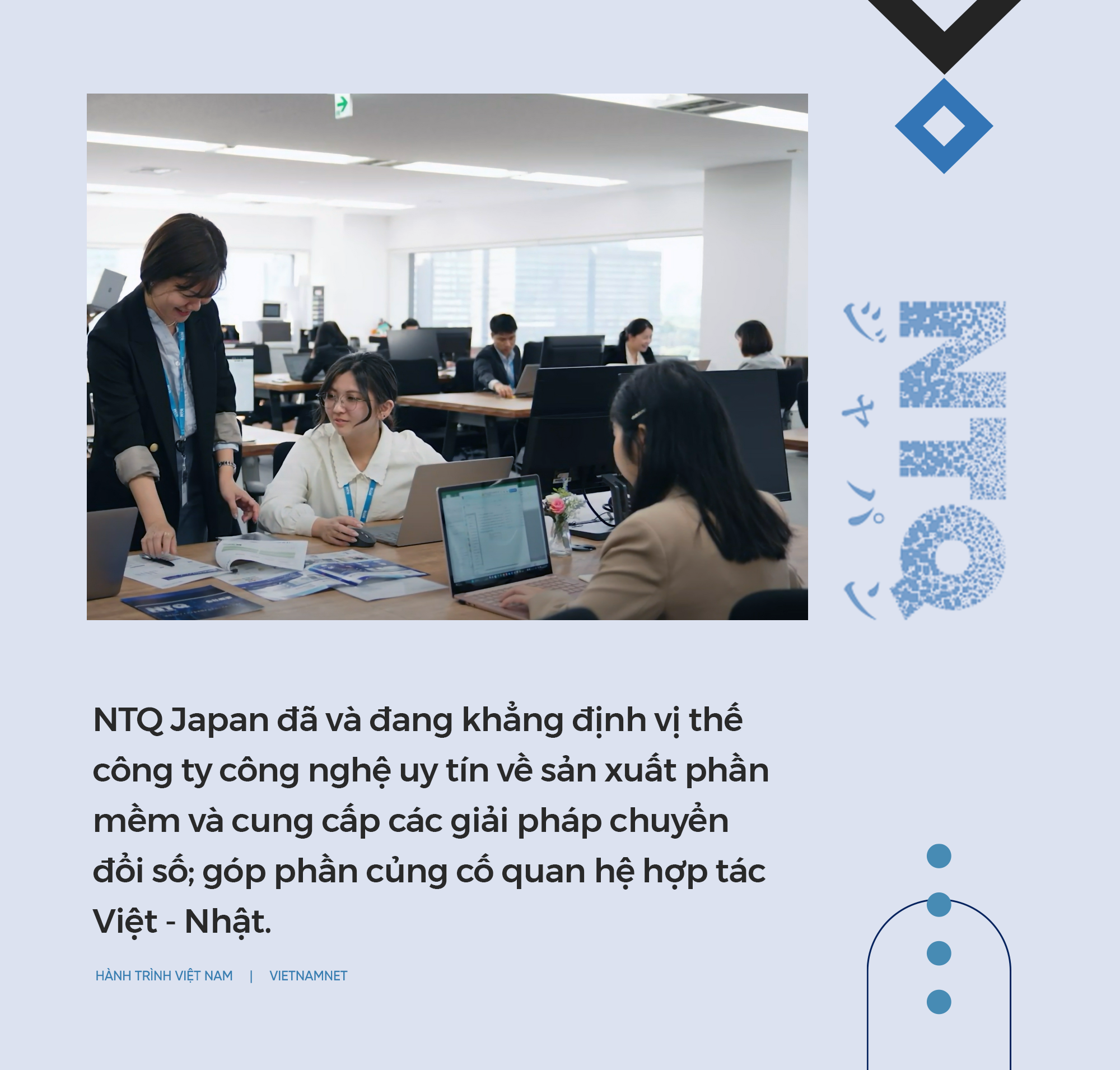 NTQ Japan là chi nhánh quốc tế đầu tiên của NTQ Solution. Thành lập đầu năm 2016, NTQ Japan đã nhanh chóng trở thành "cú đấm thép" của NTQ Solution tại thị trường Nhật Bản. Sau 7 năm thành lập và phát triển, NTQ Japan đã và đang khẳng định vị thế công ty công nghệ uy tín dẫn đầu về sản xuất phần mềm và cung cấp các giải pháp chuyển đổi số, là đối tác tin cậy của nhiều công ty, tập đoàn lớn tại Nhật Bản và quốc tế.