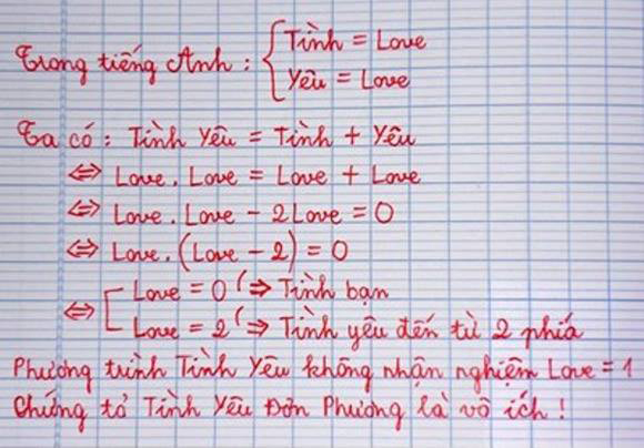 Hay một bài học khác cho ra 2 nghiệm, hoặc Love (Tình yêu) bằng 0 hoặc bằng 2. Nghĩa là trong tình yêu, nếu tình cảm không xuất phát từ cả 2 phía thì chỉ có thế là bạn (bằng 0), tình yêu đơn phương là vô ích.