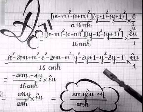 Những phương trình đại số này (đại số là môn toán dùng ký tự, ký hiệu thay cho số đếm) thường khá đơn giản, chỉ là những bài toán rút gọn biểu thức hoặc bài tìm nghiệm thông thường nhưng khi giải ra sẽ cho ta một lời tỏ tình rất dễ thương. Chẳng hạn như đề bài rút gọn biểu thức trên, biểu thức trông khá rối mắt nhưng chỉ cần một chút kiến thức toán học cơ bản, ta đã có thể rút gọn về biểu thức “em yêu anh”.