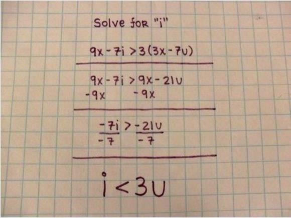 Hay như bất phương trình trên, tìm nghiệm cho I, và cuối cùng ta tìm được một nghiệm vô cùng lãng mạn là… “I nhỏ hơn 3U”, trông gần giống như câu tỏ tình “I Love You”. Lưu ý, dấu “<” (nhỏ="" hơn)="" và="" số="" 3="" đứng="" cạnh="" nhau="" tạo="" ra="" hình="" trái="" tim="" nằm="">
