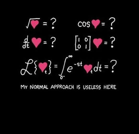 Để hiểu những bài toán như trên, bạn cần có kiến thức về ma trận hay các phép tính giới hạn (Lim) và tích phân. Hơi khó hiểu nhưng nhìn qua có thể giải thích ý nghĩa của biểu thức 1 (phía trên bên trái) là tổng của biểu thức khi nghiệm tình yêu chạy từ “me” (tôi) đến “you” bằng “vô cùng”. Hay như biểu thức 2 (phía trên bên phải), đó chính là ma trận đối xứng mà ma trận nghịch đảo của nó vẫn bằng chính nó, giống như trong tình yêu dù mọi thứ có đảo lộn thì vẫn có “me”, “you” và “trái tim hồng”.