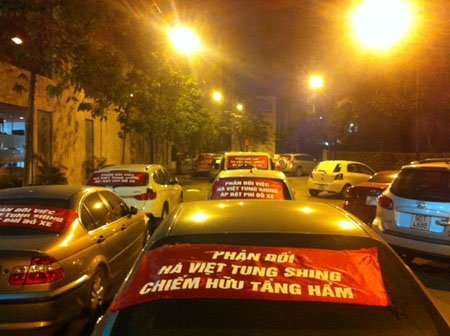 Tối 4.2, hàng trăm ô tô vẫn đỗ quanh khu vực chung cư GW - nơi hàng ngày dành để đỗ xe của khách. Các khẩu hiệu “Phản đối Hà Việt Tung Shing chiếm hữu tầng hầm”, “Phản đối Hà Việt Tung Shing áp đặt phí đỗ xe”, “Yêu cầu Hà Việt Tung Shing thực hiện đúng các cam kết” được cư dân treo trên xe hơn chục ngày qua.