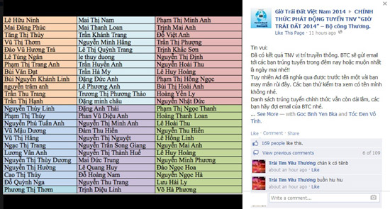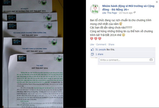 Ngay từ lúc này, cư dân mạng Việt Nam đã bắt đầu kêu gọi nhau tham gia nhiều chương trình tập thể hưởng ứng Giờ Trái Đất. Fanpage chính thức của Giờ Trái Đất Việt Nam 2014 thậm chí đã có danh sách các bạn trúng tuyển làm tình nguyện viên vị trí truyền thông. Những ai đã đăng ký mà không có tên thì kêu than ngất trời: “Chán, không có tên. Buồn hiu hiu” - nick Trái Tim Yêu Thương than vãn.