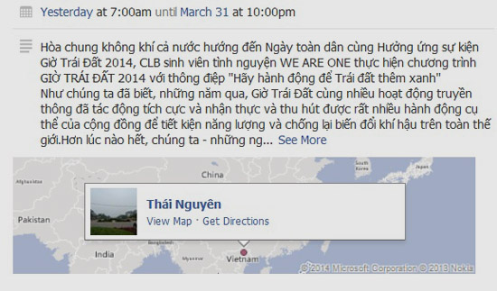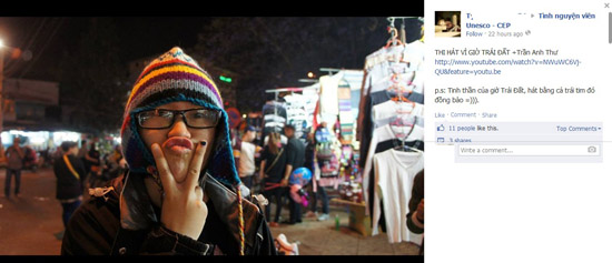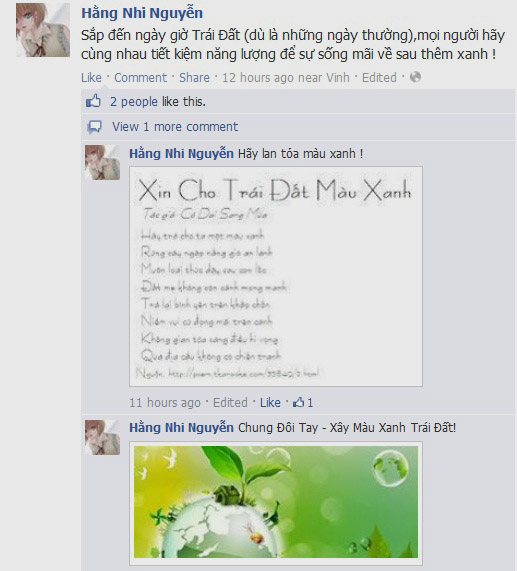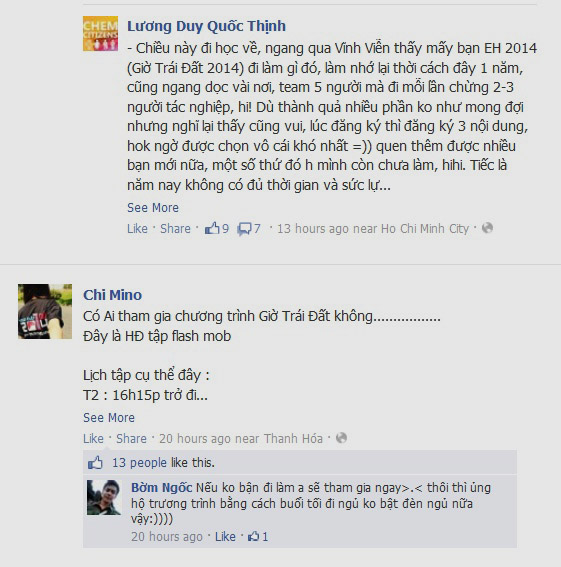 “Chiều nay đi học về thấy mấy bạn Giờ Trái Đất 2014 đi làm gì đó, làm nhớ lại thời cách đây 1 năm, cũng ngang dọc vài nơi, đội 5 người mà mỗi lần đi chừng 2-3 người tác nghiệp. Dù thành quả nhiều phần không như mong đợi nhưng nghĩ lại thấy cũng vui, quen thêm được nhiều bạn mới”.
