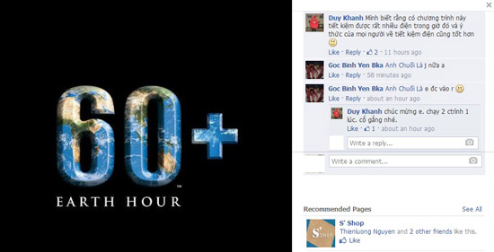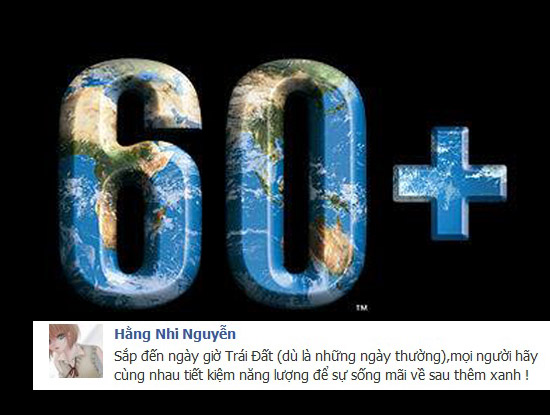 Lúc này khi lướt trên dòng thời gian Facebook, bạn đã có thể cảm nhận thấy Giờ Trái Đất bắt đầu “nóng ”, với những lời kêu gọi tiết kiệm năng lượng, những bài thơ viết vội hay những hình ảnh đẹp chào đón Giờ Trái Đất. Dự kiến càng đến gần Ngày Trái Đất, các hoạt động trên mạng sẽ càng rầm rộ hơn nữa.