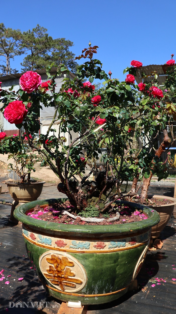 Toàn cảnh chậu hoa được chủ nhân tưới nước, chăm sóc từng ngày. Anh Minh cho biết: "Để định giá một gốc bonsai hoa hồng, người chơi cần đánh giá về nhiều yếu tố như độ cổ, tuổi, dáng thế và chủng loại của chúng. Chính vì vậy, nhiều chậu với người đam mê thì rất có giá trị, ngược lại với những người không thích và tâm huyết thì chúng chỉ là cái cây trồng trong vườn, không có giá trị cao".