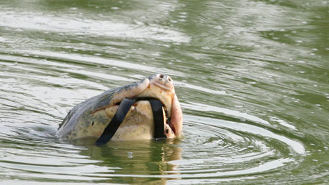 Cụ Rùa bị vướng phải dây cao su khi nổi lên ngụp xuống ngày 22/11. (Ảnh: VnExpress)