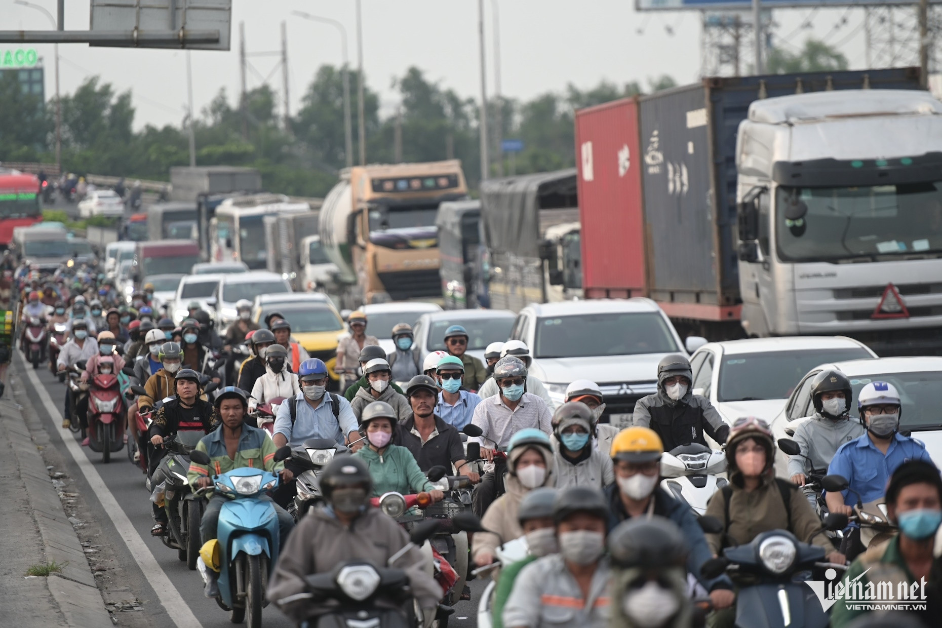 Ùn tắc không lối thoát qua khu vực cầu Bình Điền. Dòng xe đang xếp hàng nối dài từ đường Kinh Dương Vương qua vòng xoay An Lạc để ra quốc lộ 1. Ảnh: Nguyễn Huế.