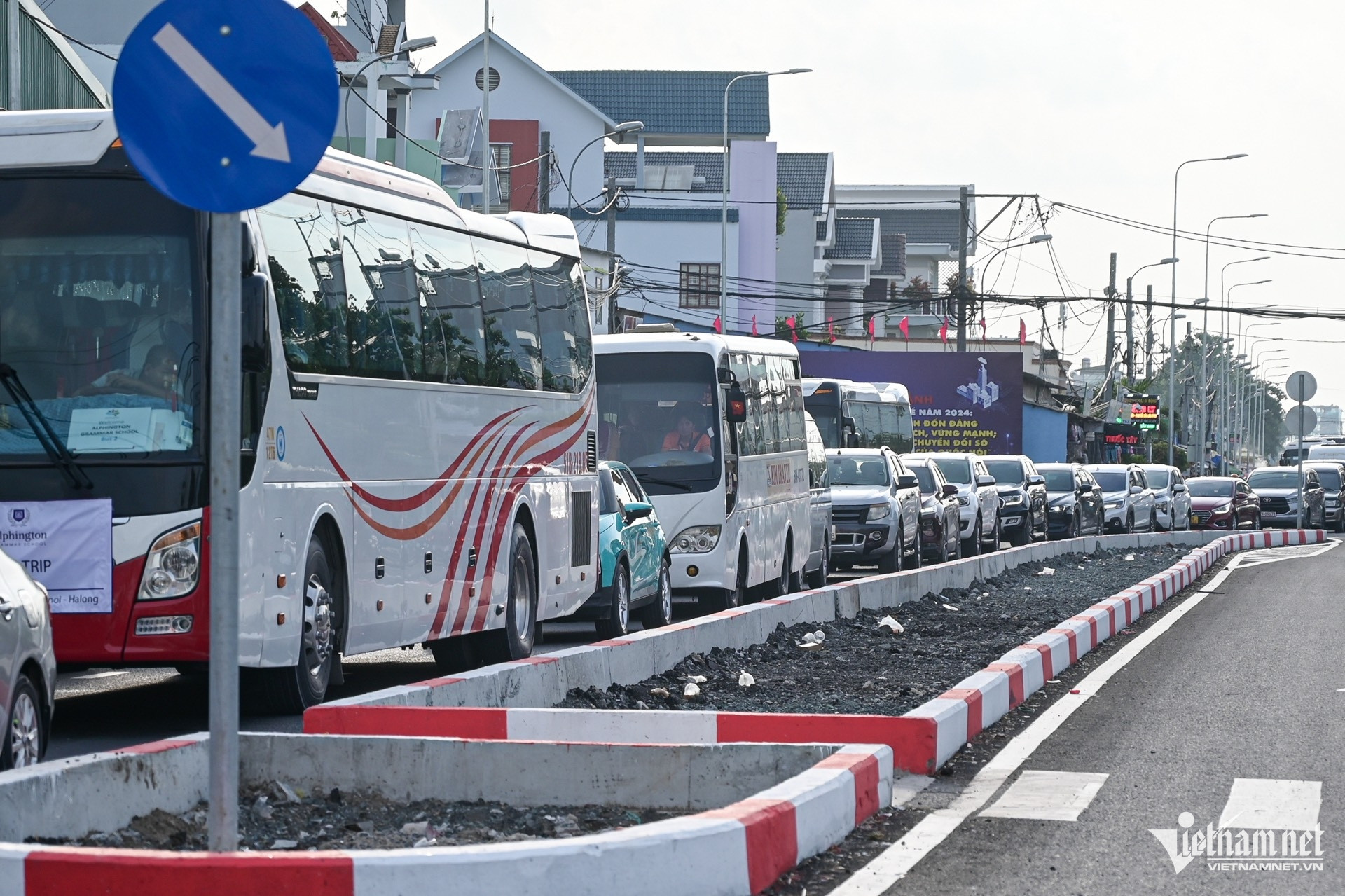 Ô tô khách mắc kẹt giữa "biển" người đang chạy xe máy. Dưới cái nắng oi bức, nhiều người tỏ ra mệt mỏi, căng thẳng. Ảnh: Nguyễn Huế.