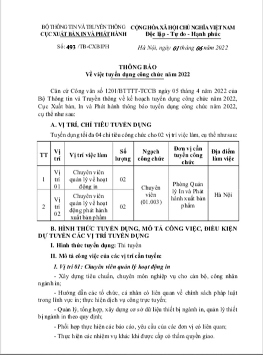 Cục Xuất bản, In và Phát hành (Bộ Thông tin và Truyền thông) vừa đăng thông báo tuyển dụng công chức năm 2022.