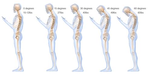 “Khi đầu cúi về phía trước, lực tăng lên 12,2kg ở 15 độ, 18kg ở 30 độ, 22kg ở 45 độ và 27kg ở 60 độ”, bác sỹ viết trong bài báo.