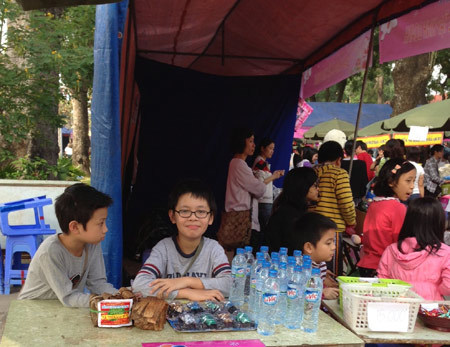 Gian hàng bánh gai và nước khoáng của bé Hột (đeo kính) trong một hội chợ |