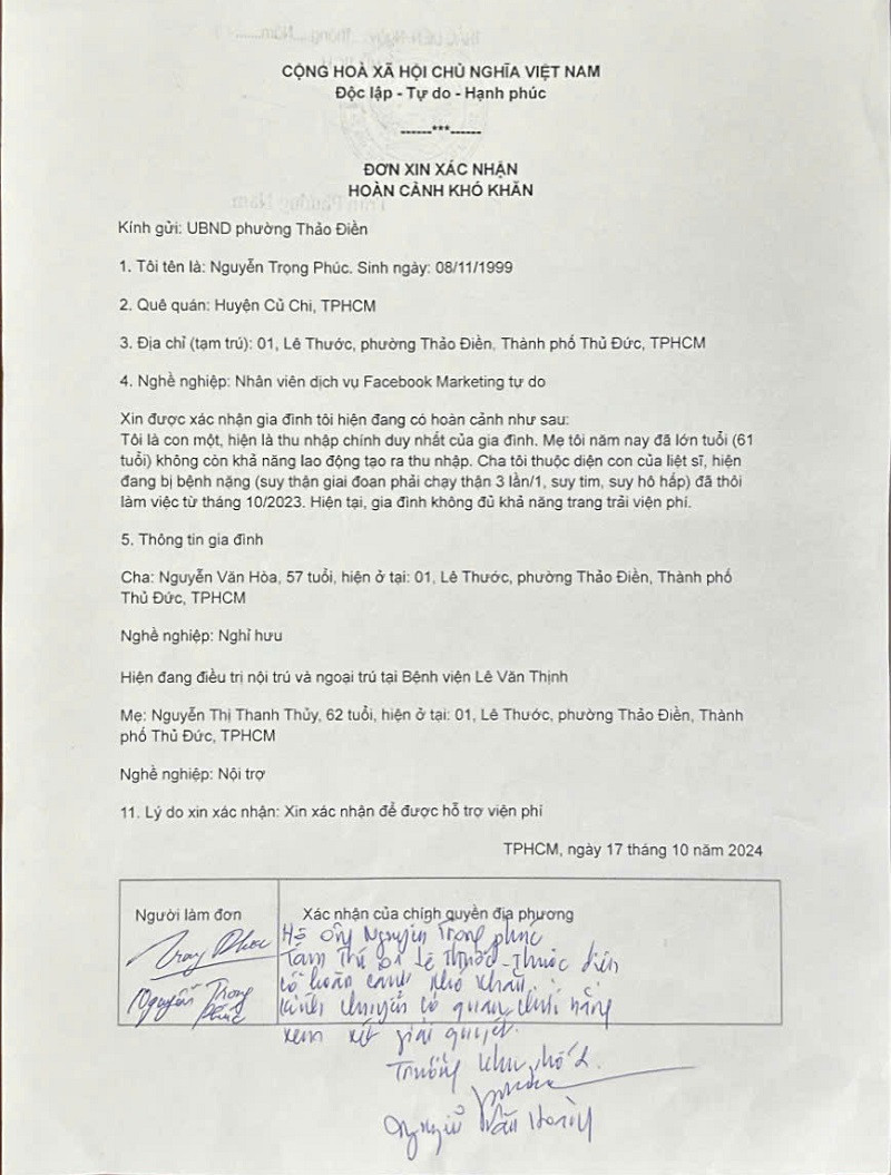 Anh Phúc là người con duy nhất của vợ chồng ông Hòa. 4 năm trước, do kinh tế khó khăn, anh đã bỏ dở việc học khi đang là sinh viên năm 3 của một trường đại học tại TP.HCM. Anh vừa chạy xe ôm công nghệ, vừa làm thêm cho công ty quảng cáo để lo tiền đóng trọ và phụ chi phí sinh hoạt của gia đình. Từ lúc cha đổ bệnh, một mình anh gánh vác viện phí và chăm sóc cha mẹ. Thu nhập khoảng 10 triệu đồng, vun vén thế nào cũng chẳng đủ.