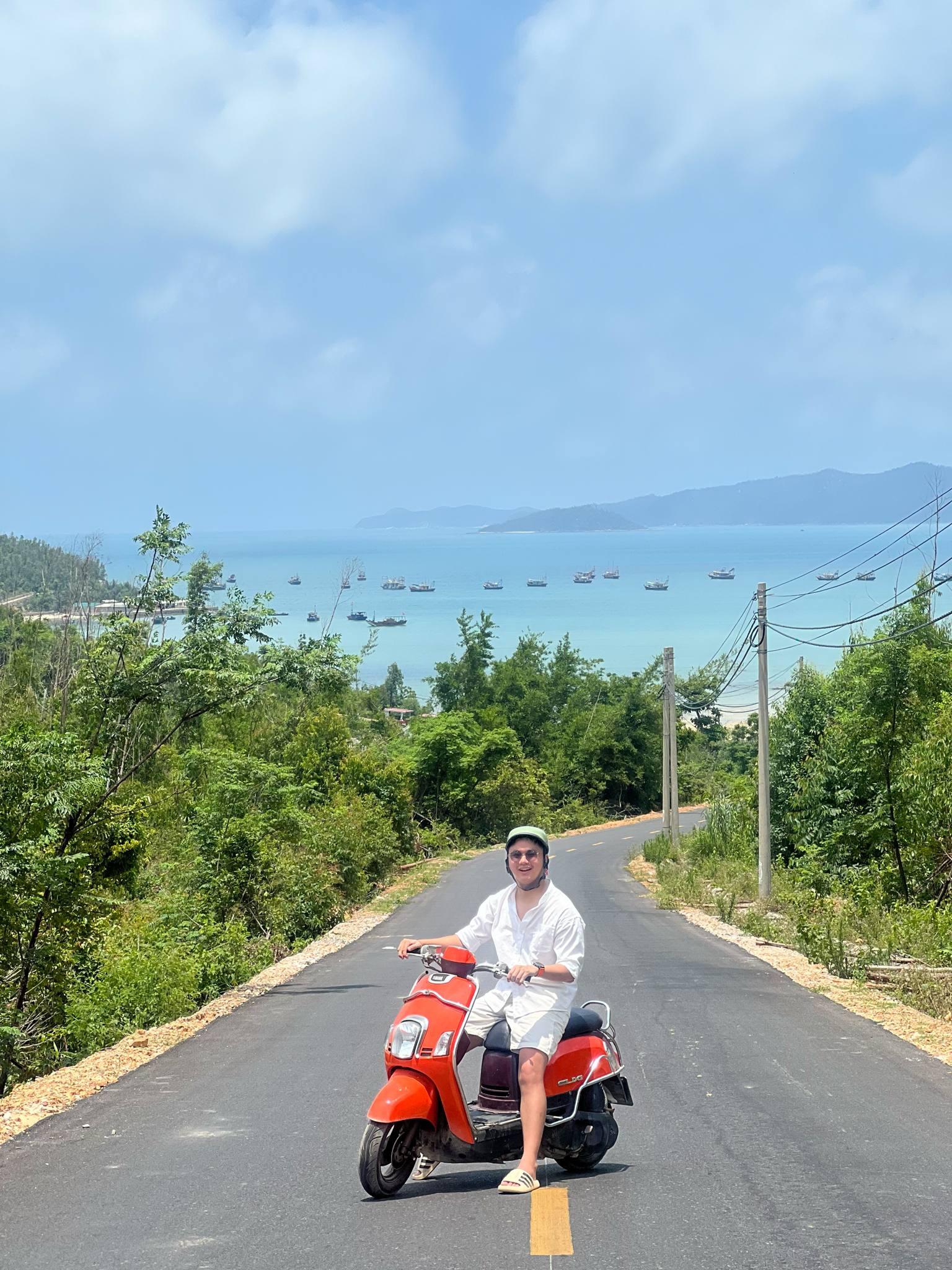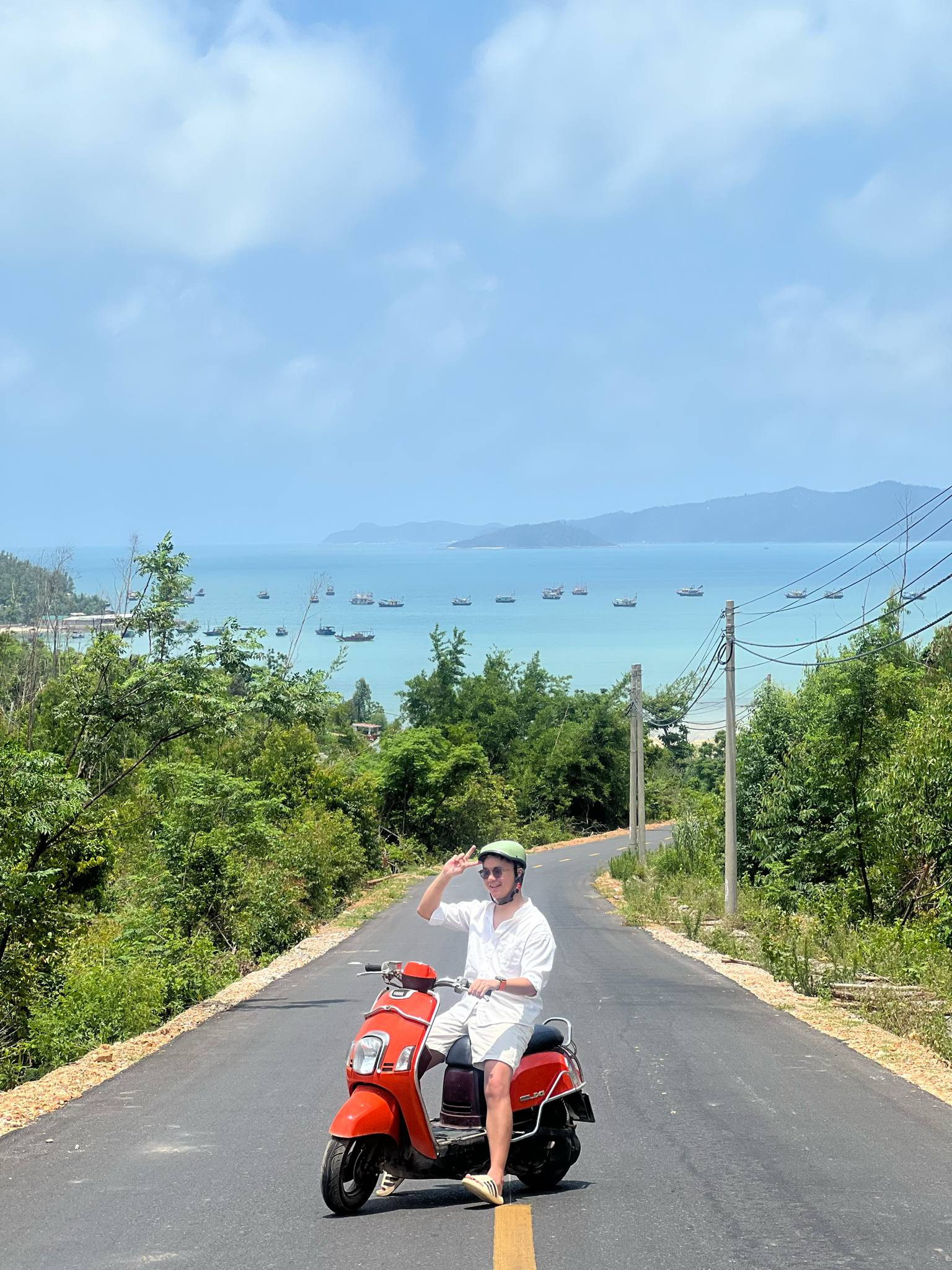 “Khi chạy dọc cung đường uốn lượn quanh biển này, mình không khỏi trầm trồ trước khung cảnh nên thơ tuyệt đẹp. Tới đoạn dốc cao và nhìn từ trên xuống, mình thấy cảnh biển xanh biếc hiện ra nên dừng lại chụp ảnh, rồi quay video.