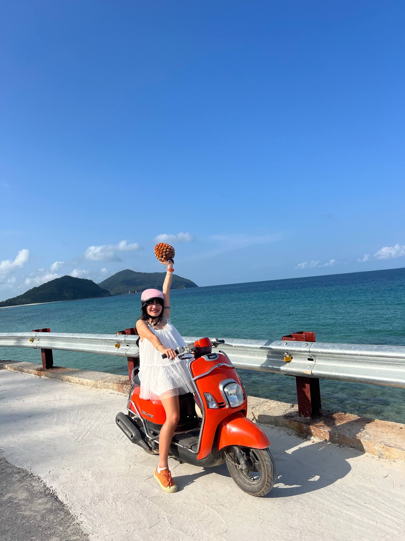 Để có những thước phim đẹp như tranh trên cung đường hướng biển, dẫn tới Eo Gió ở Quan Lạn, nữ du khách 25 tuổi lựa chọn di chuyển qua đây vào khung giờ trưa, khi nắng lên cao.