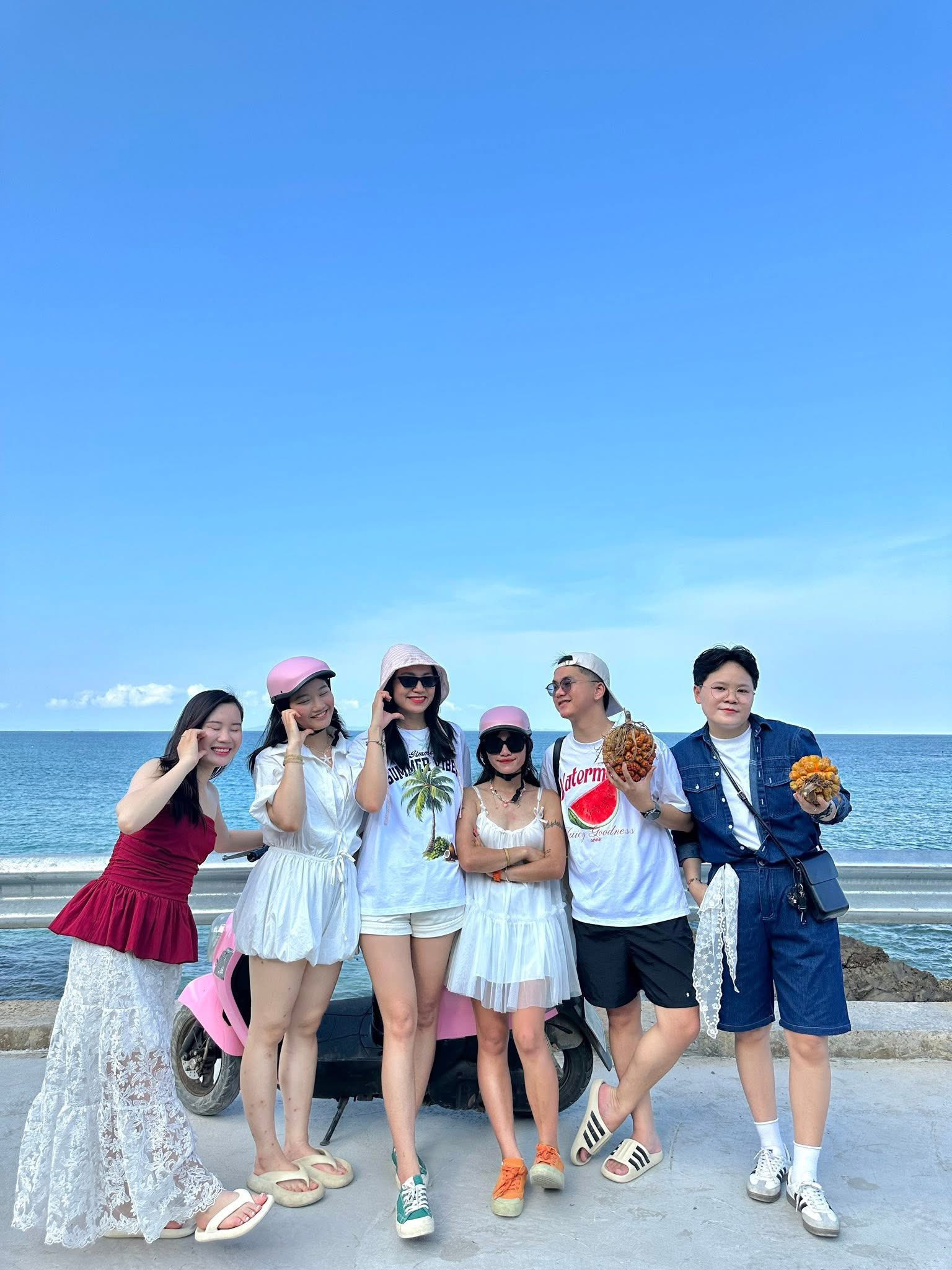 Giống như Thùy, một số du khách tới Quan Lạn cũng không ngại nắng nóng, dừng chân trên cung đường này lúc giữa trưa. Họ tranh thủ thời điểm ít xe cộ qua lại để có thể chụp được những bức ảnh đẹp.