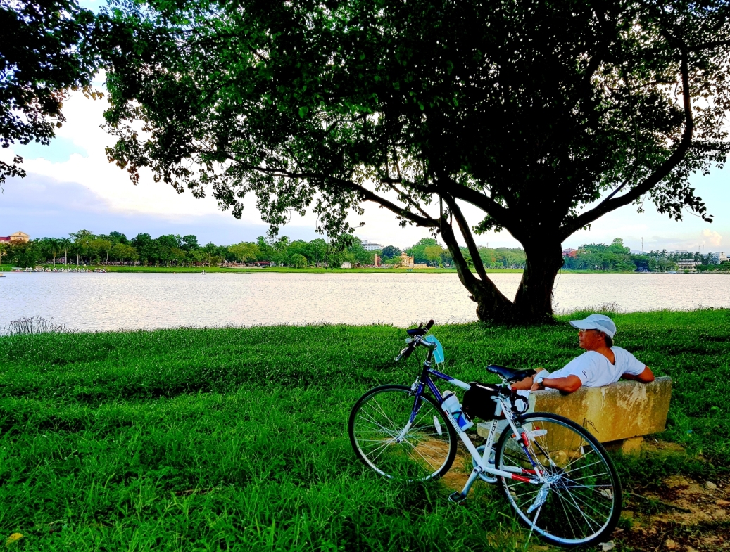 Phút bình yên, thư thái bên bờ sông Hương của một người dân sau giờ đạp xe tập thể dục. |