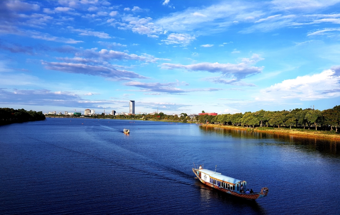 Dòng sông Hương chảy qua lòng TP. Huế và đường đi bộ nép ở hai bên, dưới những tán cây xanh. |