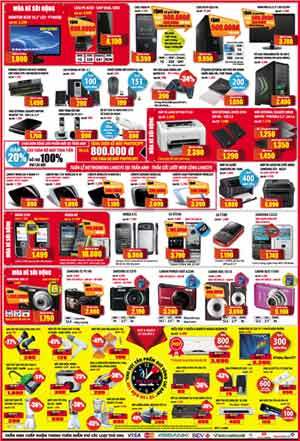 Thiết bị số: Nokia E72 giảm còn 6.860.000 đồng. Giảm 1.100.000 đồng cho LG GT540 còn 3.790.000 đồng, tặng kèm thẻ nhớ 2Gb. Samsung C3222 giảm còn 1.740.000 đồng, tặng kèm chuột không dây và thẻ nhớ 1Gb. Giảm 959.000 đòng cho máy ảnh Samsung EC-PL100, tặng thêm thẻ nhớ, ba da và áo thun. Giảm 800.000 đồng cho máy ảnh Canon Ixus 105IS còn 3.690.000 đồng, tặng thêm thẻ nhớ và ba da.