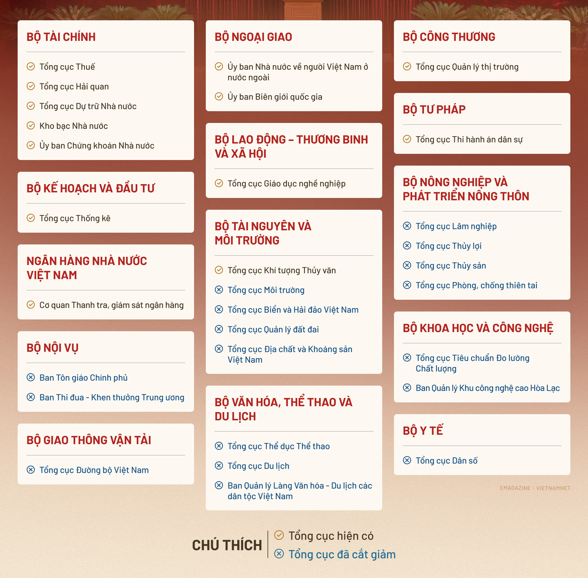 Sau khi sắp xếp, cắt giảm tổng cục, hiện các bộ ngành còn 13 tổng cục và tương đương.