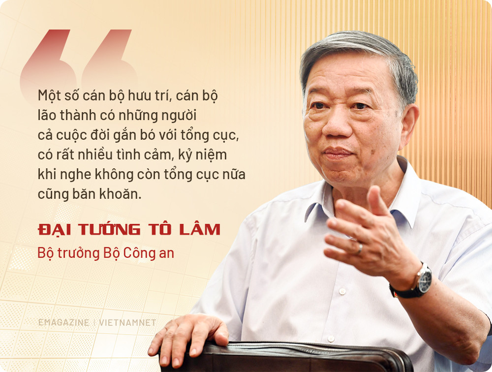 Chia sẻ với VietNamNet ngay sau khi thực hiện cắt giảm tổng cục, Đại tướng Tô Lâm, Bộ trưởng Công an cho biết, lúc đầu đa số anh em đồng ý nhưng cũng có nhiều ý kiến còn băn khoăn. Đặc biệt, một số cán bộ hưu trí, cán bộ lão thành có những người cả cuộc đời gắn bó với tổng cục, có rất nhiều tình cảm, kỷ niệm khi nghe không còn tổng cục nữa cũng băn khoăn.