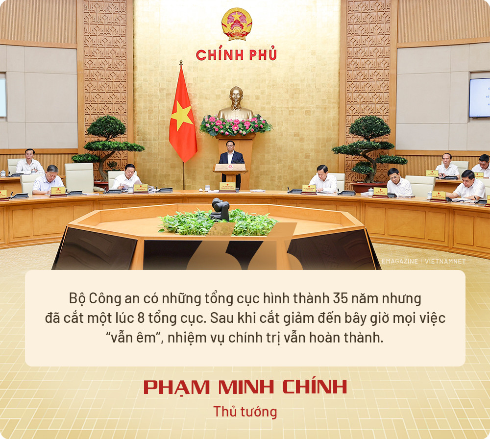 Tại hội nghị tổng kết ngành nội vụ, Thủ tướng Phạm Minh Chính đã dẫn chứng, Bộ Công an có những tổng cục hình thành 35 năm nhưng đã cắt một lúc 8 tổng cục. Sau khi cắt giảm đến bây giờ mọi việc “vẫn êm”, nhiệm vụ chính trị vẫn hoàn thành.