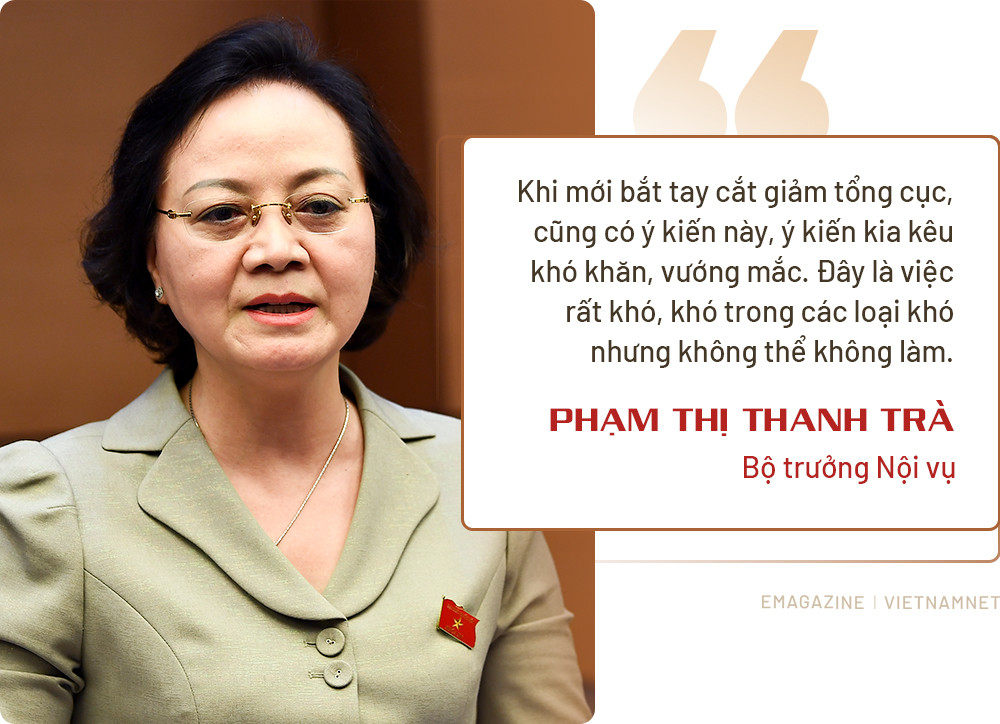 Lý do việc cắt giảm tổng cục kéo dài hơn so với yêu cầu của Thủ tướng như Bộ trưởng Nội vụ Phạm Thị Thanh Trà chia sẻ với VietNamNet, khi mới bắt tay làm, cũng có ý kiến này, ý kiến kia kêu khó khăn, vướng mắc. Đây là việc rất khó, “khó trong các loại khó nhưng không thể không làm”.