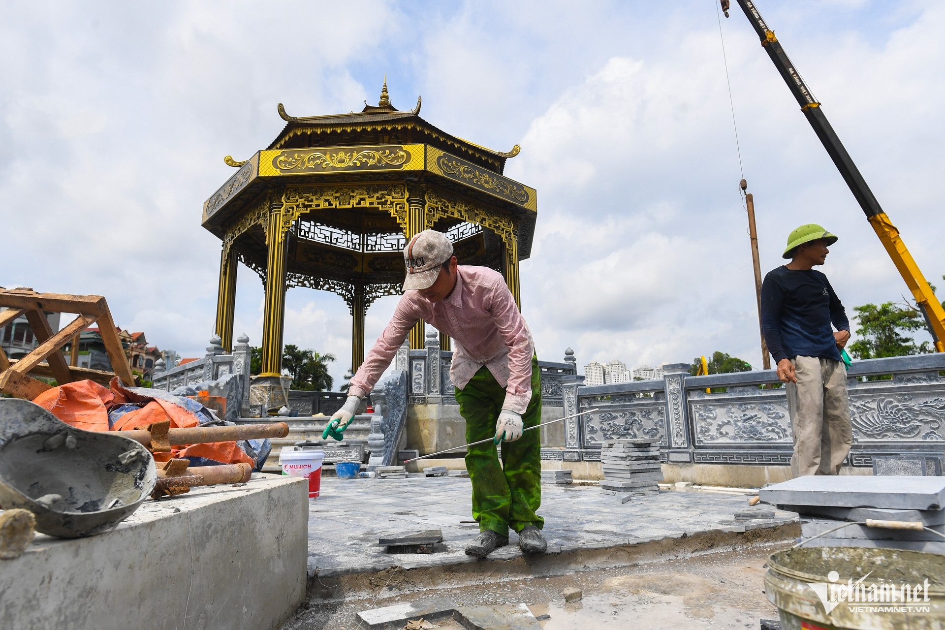 Trong chiều nay, công nhân tiếp tục thi công lát đá tại khu vực đập dâng này. Đập được khởi công từ giữa tháng 2/2025 và hiện đã hoàn thành khoảng 95% hạng mục, bao gồm phần thân chính, van điều tiết, trạm bơm, cầu đi bộ và đài quan sát hình bát giác.