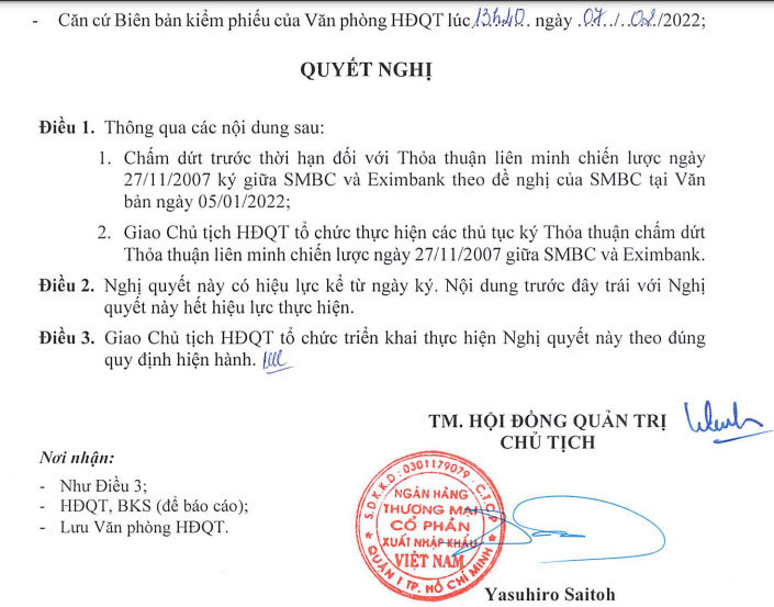 Hội đồng quản trị Ngân hàng TMCP Xuất Nhập Khẩu Việt Nam - Eximbank (EIB) vừa có Nghị quyết về việc chấm dứt trước thời hạn thỏa thuận liên minh với cổ đông Nhật Bản SMBC theo đề nghị của SMBC tại văn bản ngày 5/1/2022.