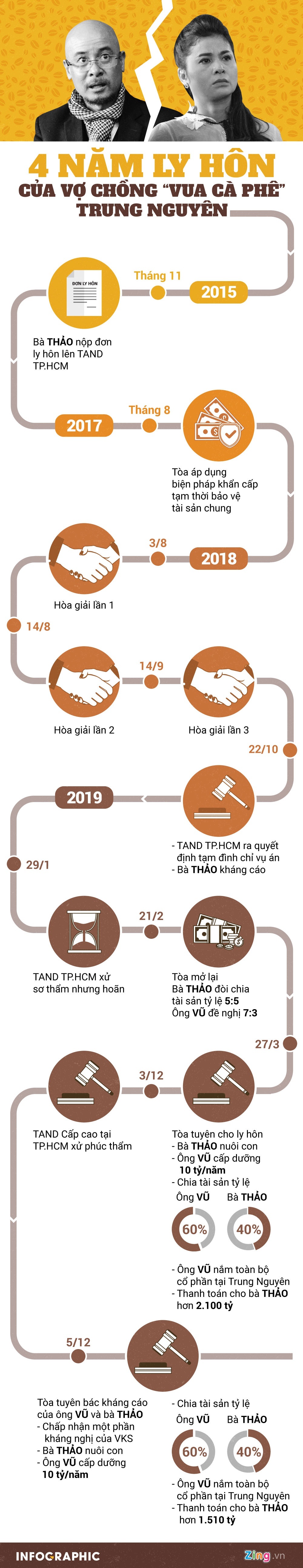 Bà Thảo nộp đơn ly hôn từ 2015 nhưng 4 năm sau, tòa cấp phúc thẩm mới chấp thuận để vợ chồng bà ly hôn. Bà Thảo bị tước hết quyền hành ở các công ty trong Tập đoàn Trung Nguyên.
