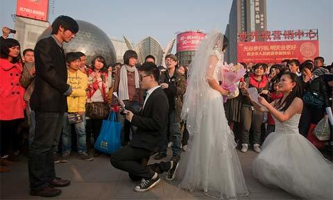 Hai cặp đồng tính luyến ái tổ chức lễ cưới tại một trung tâm mua sắm để tăng nhận thức về hôn nhân đồng giới ở Vũ Hán, Hồ Bắc, Hubei, Trung Quốc hồi tháng 3/2011. (Ảnh: Getty)